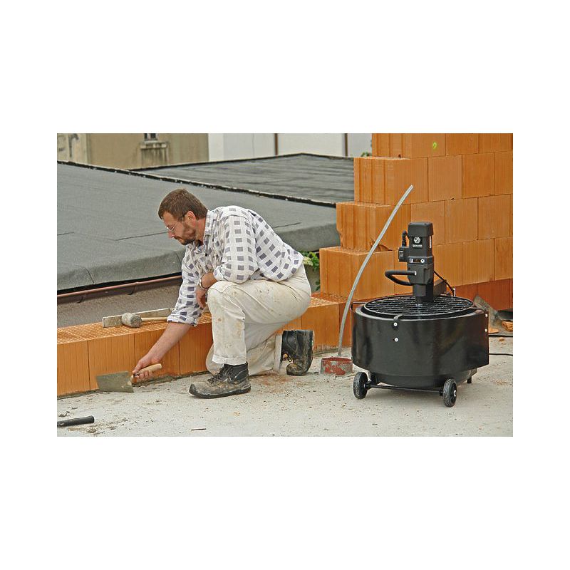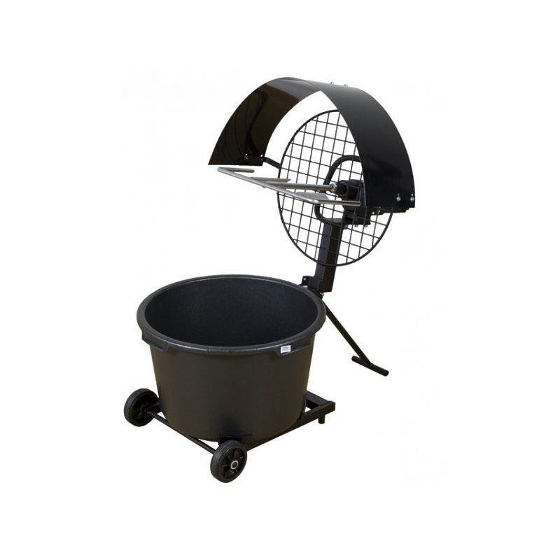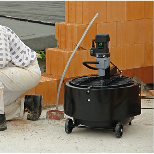 Мощность миксерной установки составляет 1500 Вт. Низкий вес и компактная конструкция установки обеспечивает простоту транспортировки и хранения. Установка перемещается на тележке с Т-образной ручкой. Защитная решетка обеспечивает простоту и безопасность добавления материала, поставляемого в мешках. Установка используется для гражданского строительства, ремонта полов и для ландшафтных работ.