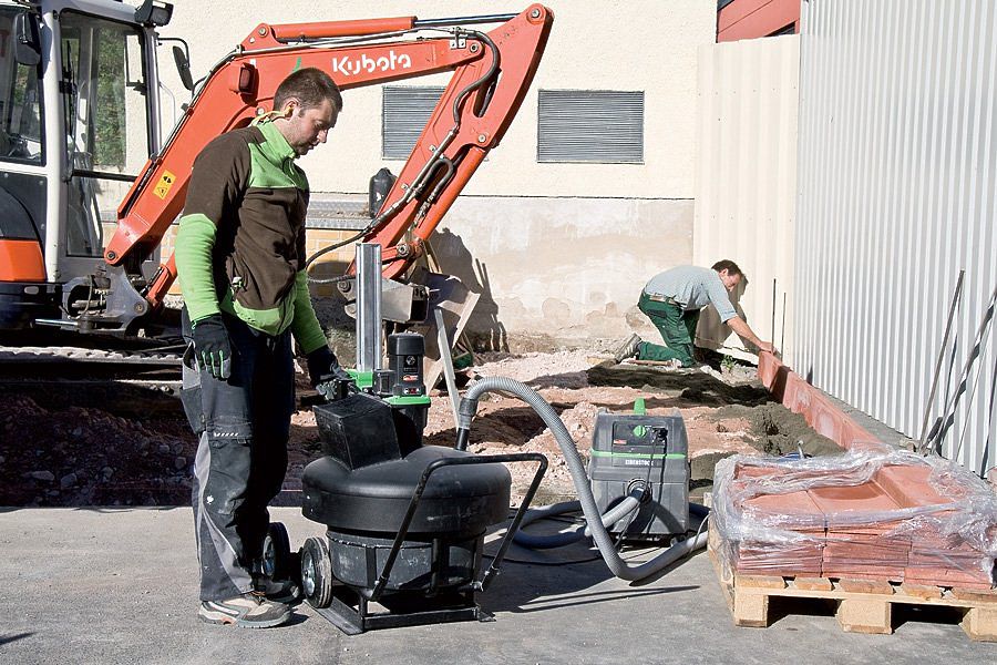 Перемешивание материалов происходит без вреда для здоровья. Материал загружается через загрузочную воронку с щетками, а при перемешивании предусмотрен патрубок для подключения пылесоса и удаления пыли.